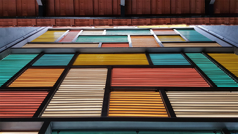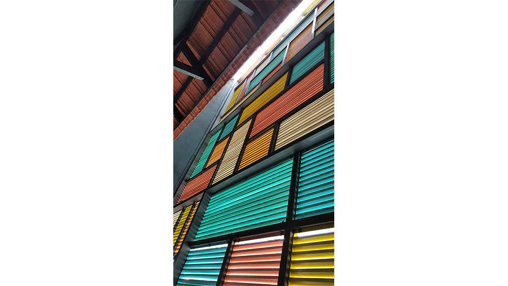 The traditional rear façade brise soleil comprises modernised Malaccan vintage window frames. The vivid colored frames are arranged to illustrate a contrasting giant art piece where modernity and tradition converge.